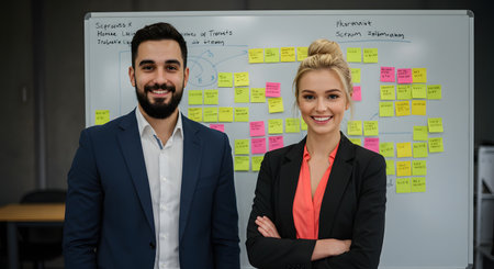Portrait of smiling business people standing in front of whiteboard in office