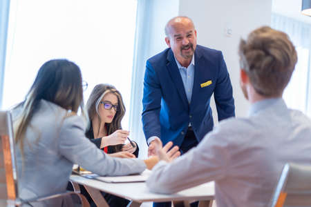 Professional businesspeople brainstorming the current project for their meeting in modern office room