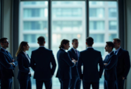 A soft-focus scene shows business professionals standing together in an office, suggesting a collaborative corporate environment.
