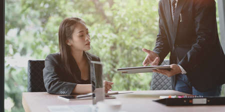 Senior caucasian manager working in office with assistance of young Asian business people and translator in the meeting. Corporate international business and secretary language translation concept.