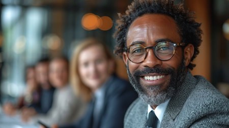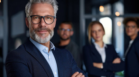 A confident businessman with glasses poses in a modern office environment, surrounded by colleagues who exemplify teamwork and professionalism.