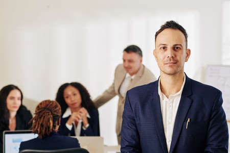 Portrait of smiling handsome businessman looking at camera when his coworker working on new creative project in background