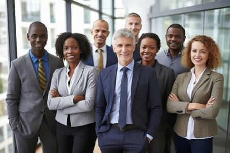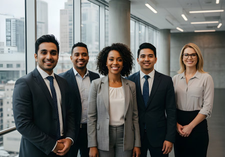 A diverse group of business professionals stands together in a modern office, dressed in formal attire, posing for a photo.