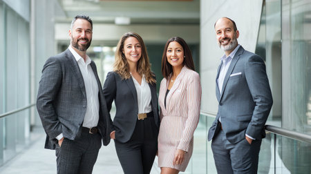 Group of professionals posing confidently in a bright office setting, showcasing teamwork and success.