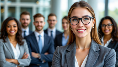 A confident woman in glasses leading diverse business team, showcasing professionalism and teamwork in modern office environment