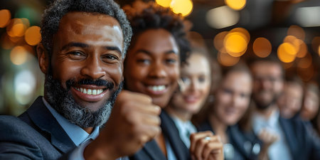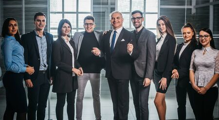 In a demonstration of teamwork and corporate success, a diverse group of young and senior business professionals come together for a portrait in the office, highlighting the spirit of partnership and collaboration.