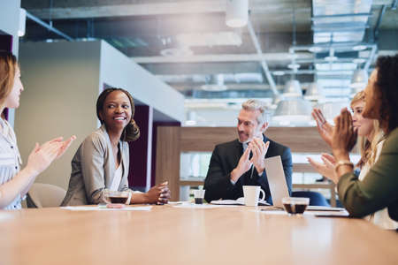 Great job. Low angle shot of a group of businesspeople applauding a colleague while sitting in the boardroom during a meeting.