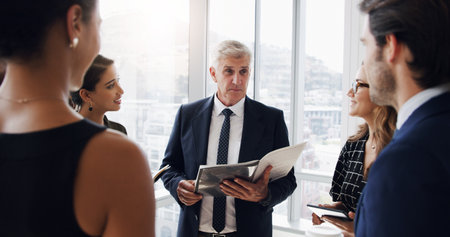 Leadership vision, innovation and teamwork of a business team in an office work meeting. Corporate executive group discussing a collaboration strategy. Finance workers planning a project together