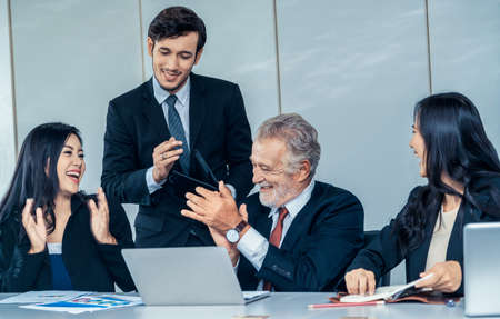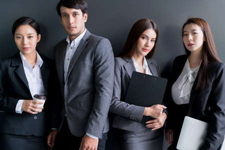 group of smart young asian businessmale and female formal dress teamwork laugh smile standing hand point portrait confident and leadership determination modern office design background