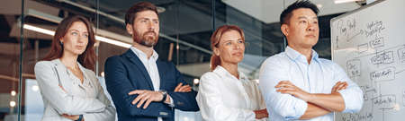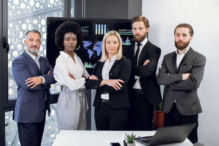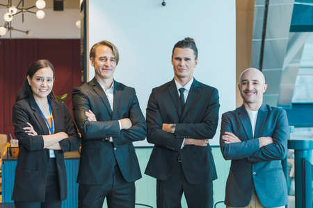 Multiethnic confident business people crossed arms in modern office at business district