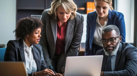 A diverse team collaborates around a laptop in an office. They discuss strategies, share insights, and demonstrate teamwork in a professional environment.
