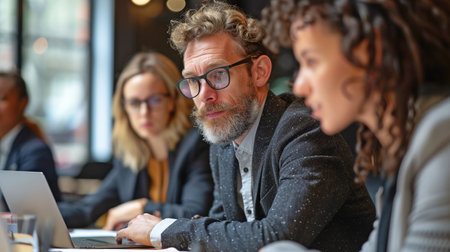 Several Persons in a Business Meeting, Seated at a Table, Gazing at a Laptop.