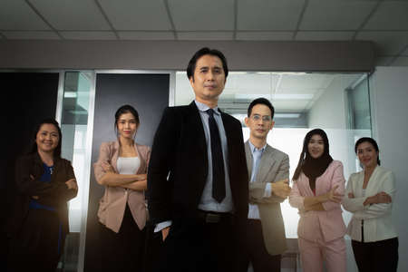 Confident leader hands in pocket with success and confident happy teamwork various culture members standing at front meeting room, Teamwork of Employee, Business vision, Leadership concept