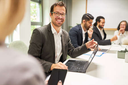 Happy business man as consultant with laptop computer at conference table while consulting
