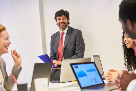 businessman conducts training with business team
