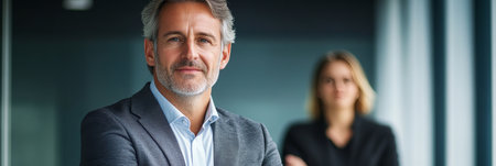 Confident Businessman and Blurred Office Woman Collaborating for Innovative Modern Office Solutions
