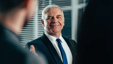 Confident business partners meeting in office, standing and shaking hands, talking, discussing collaboration. Medium shot. Communication or partnership concept