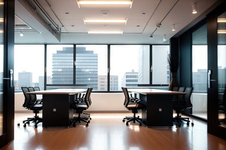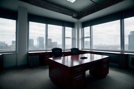 A Room With A Desk, Chairs, And Large Windows. Generative AI