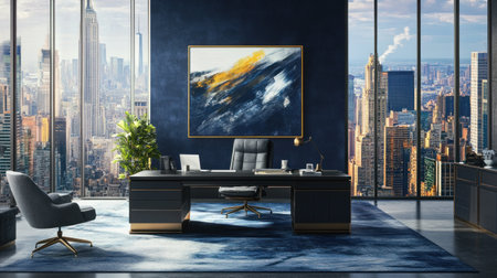 Modern office interior with a dark blue wall, a black desk, and gray chairs near a window overlooking a cityscape. Minimalist design of a modern business or executive workspace. Concept for a professional studio in an urban setting. 3D rendering, 45-degree angle. --chaos 30 --ar 16:9 --v 6.1 Job ID: 51b58249-82f8-4670-a082-2aefab07225f