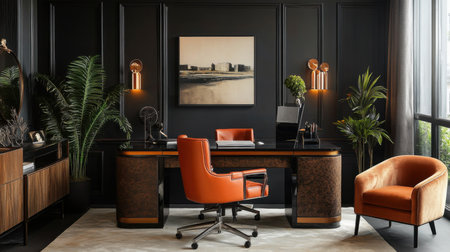 A modern home office with dark walls, orange chairs, and stylish furniture. The design is elegant and sophisticated.