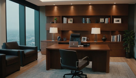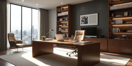 Elegant executive office with a walnut desk, ergonomic leather chair, and modern wooden bookshelves. Task lighting provides focused illumination