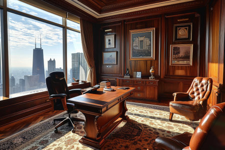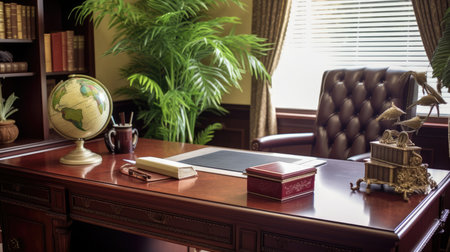 A traditional executive office, bathed in warm light, featuring dark wood furniture, bookshelves, and a framed artwork, conveying a sense of classic elegance.. AI Generation