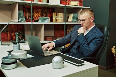 Portrait of young businessman sitting at his desk front of computer in the office. Confident entrepreneur working with the laptop on some project at a white table, he is thinking and looking up