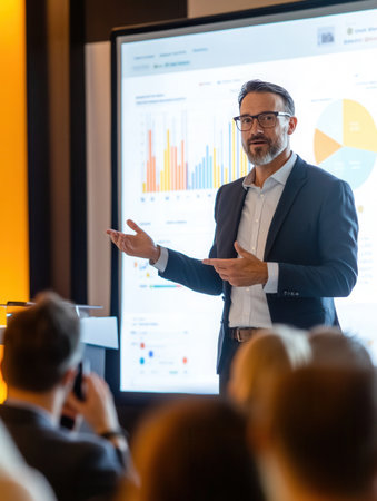 An expert confidently delivers a presentation at a conference, highlighting colorful charts and graphs displayed on a large screen.