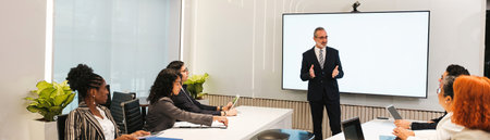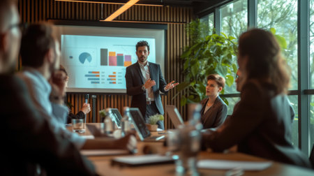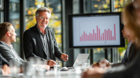 A confident male leader delivers a presentation, gesturing towards a digital display with charts in a bright, open-plan meeting room. The setting is modern and professional.