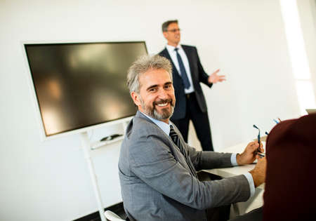 a handsome middle aged businessman giving a presentation during a meeting in a boardroom.