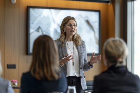 Confident presenter engaging audience during startup pitch, business setting. generated by ai