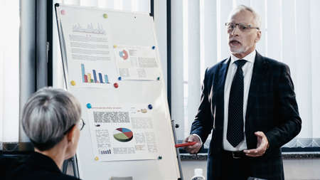 Mature businessman in formal wear talking near flip chart and colleague in office