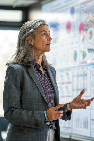 Medium shot of a focused professional presenting data visualizations during a meeting facilitating strategic discussions with clear graphical insights.