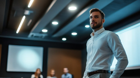 A young man stands confidently while presenting to an engaged audience in a contemporary conference room equipped with modern technology.