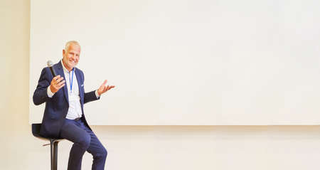 Portrait of Motivational Speaker, Talking about Happiness, Self, Success, Empowerment, Efficiency and How to Be More Productive Self. Large Conference Hall with Cinematographic Light.