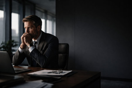 A man in a suit is sitting at his desk, looking thoughtful while working on a laptop in a modern office during daytime.