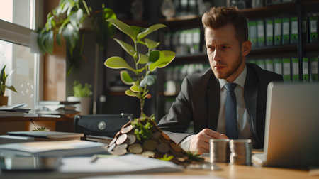 A focused man works on his laptop in a bright, modern office, surrounded by greenery and documents. The scene captures productivity and professionalism in a corporate setting.