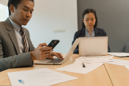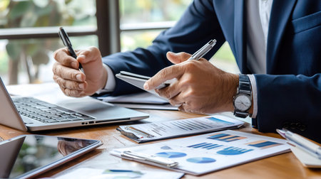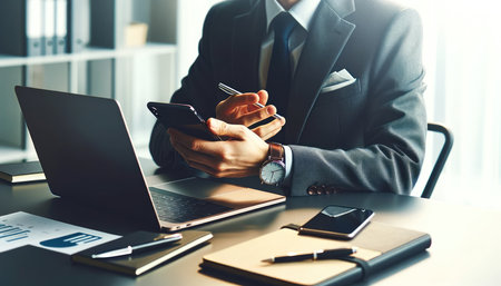 A businessman is meticulously analyzing financial data on his laptop while simultaneously using his smartphone, surrounded by charts and documents in a modern office setting.