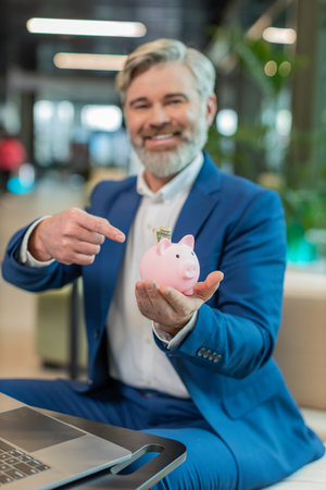 Happy mature businessman entrepreneur save money using pink piggybank putting dollar cast inside. Success, economy, investment, deposit. Bearded guy in suit sitting with laptop in modern office lobby.