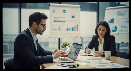 Two colleagues, a man and a woman, sit at a conference table reviewing documents and laptop data in a contemporary office with whiteboards displaying graphs and charts.