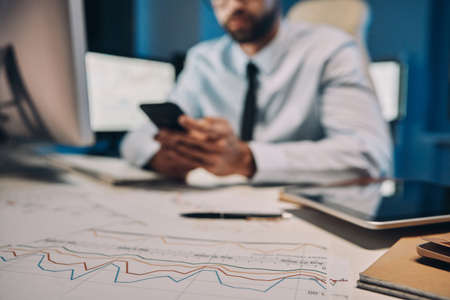 Close up of young man in shirt and tie using smart phone while staying late in the office