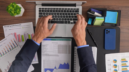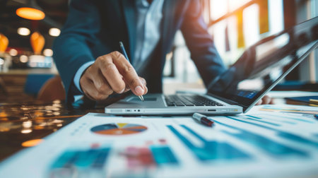 Businessman using a laptop and analyzing data on printed reports, representing business strategy, corporate finance, and professional work.