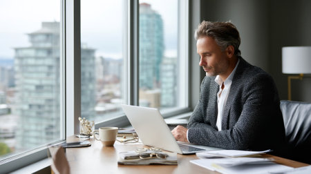 A business professional in formal attire sitting at a desk with a laptop reviewing documents surrounded by office supplies and a city view through a window