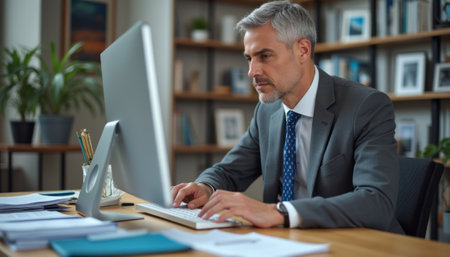 Focused businessman working diligently at his desk, immersed in his tasks. The image captures a professional man in a suit, deeply engaged with his computer, showcasing dedication and concentration in a modern office setting