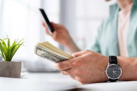 Cropped view of man holding dollars and using smartphone at home, earning online concept
