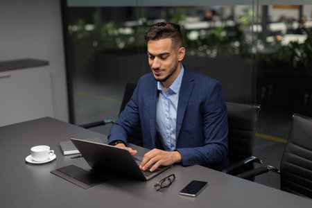 Serious businessman working on laptop at meeting table in modern office. Concentrated young man in formalwear using computer while sitting at the table. Business concept