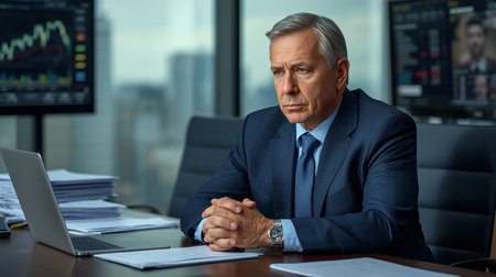 A focused businessman dressed in formal attire reviews financial reports in a modern office, showcasing a blend of professionalism and high technology in a corporate environment.