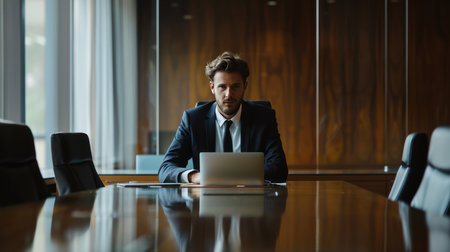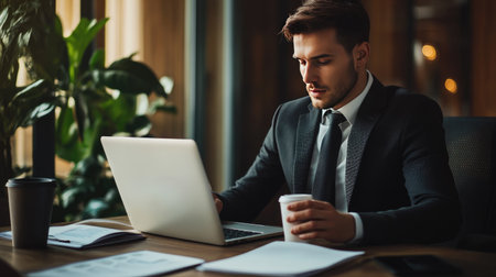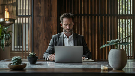 Serious male professional in suit engaged in work at his office desk with laptop and plant. corporate setting. A.I.