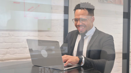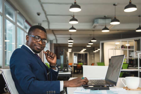 A black African American businessman in a business suit works at a laptop. Analytics and work online