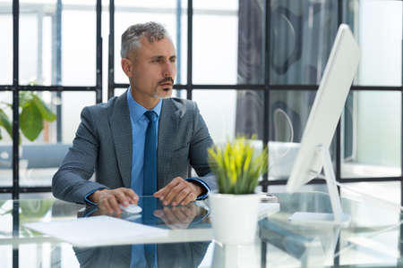 Mature businessman working on computer in modern office